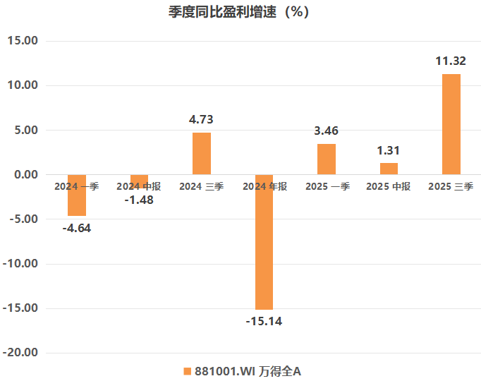 从全市场整体看,上市公司盈利周期呈现筑底回升态势,参考万得全A指数,自今年一季度以来,全A指数归母净利润增速同比去年实现每个季度正增速,而刚刚过去的三季度,全A单季度增速达到了11.32%,详细数据如下: