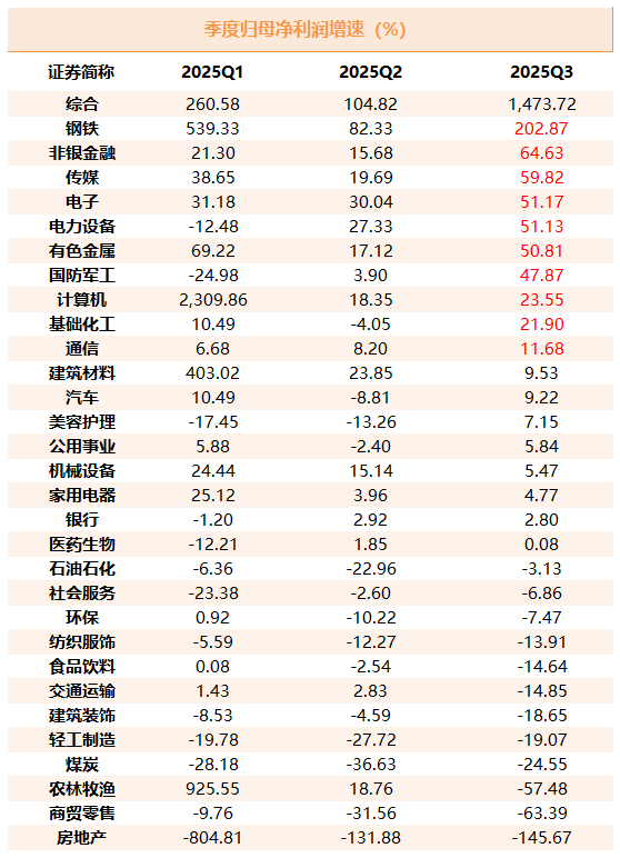 行业方面,参考申万一级行业分类近三个季度数据,反映行业盈利状况的三个现象: