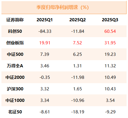 此外,科创50在前面两个季度萎靡的情况下,三季度可以说是业绩爆发式增长。统计的8只宽基里头6只指数三季度实现净利润2位数增速,详细数据如下;
