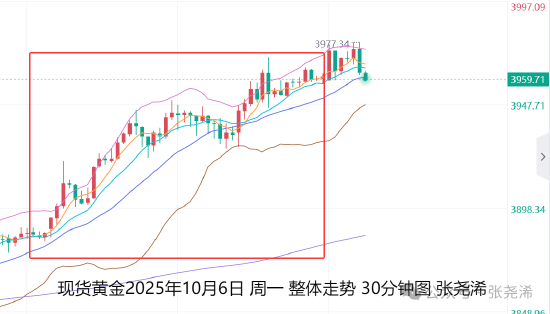 10月7日:上交易日周一(10月6日):国际黄金强势反弹拉升金猪配资,突破日内阻力,并触及上周给出的第一目标位3974美元,且进一步刷新历史高点,并持稳收阳,多头动力未有减弱迹象,短期将有望冲击4000美元关口或更高。