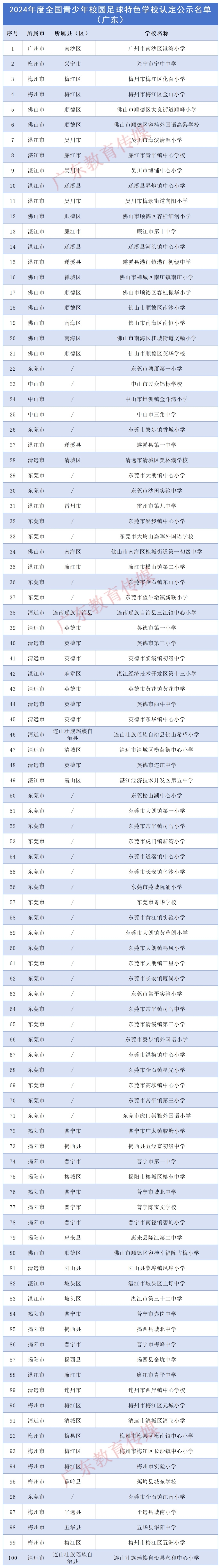 经学校自主申报、地方教育行政部门逐级审核推荐、省级教育行政部门向社会公示、教育部综合认定等程序,拟认定2024年度全国青少年校园足球特色学校5892所(完整名单点击文末“阅读原文”获取)。现予以公示,公示期为2025年5月16日至5月20日。其中,广东共有346所学校入选。